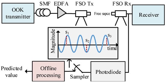 On the receiver side, a data acquisition system is used to build the dataset. It includes a PD, a sampler, and offline processing. The PD is a PIN photodiode that converts the optical signal into an electrical signal. Then, the sampler samples the signal and generates a realization of 8192 samples. Note that, if the received signal power is attenuated due to factors such as geometric loss, fiber attenuation, and channel impairments, and the resulting power level is lower than the receiver sensitivity, the receiver will not be able to detect the signal.