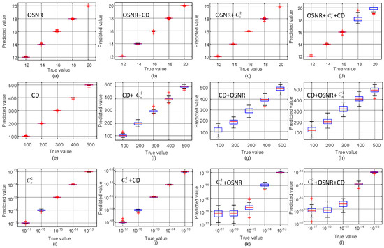 This subsection discusses the proposed model’s performance in predicting the parameter, with the results depicted in Figure 3i–l. Firstly, we examine the model’s performance in predicting the parameter when no other impairments are present in the system. Figure 3i illustrates the boxplot of the prediction, indicating high accuracy. The obtained R-squared and RMSE metrics were 1 and 0.1 , respectively. Next, we evaluated the model’s performance in predicting the parameter when the system was subject to 500 ps/nm CD impairment. The results in Figure 3j indicate that the prediction performance was similar to that in Figure 3i when there was no CD impairment. The achieved R-squared and RMSE metrics were 0.03 and 0.1 , respectively. Figure 3k reports the parameter prediction when the channel is subject to ASE noise defined by 12 dB OSNR. In this scenario, we observed that the model demonstrated high accuracy in predicting the harsh parameter, defined by high values. However, when the parameter values were low, the impact of ASE noise on the signal was high, leading to difficulty in predicting the OSNR parameter. The obtained R-squared and RMSE metrics were 0.84 and 0.57 , respectively. Finally, we evaluated the proposed model’s capability in predicting the parameter when the system was subject to harsh conditions defined by 12 dB OSNR and 500 ps/nm CD. We obtained similar results to those in Figure 3k because the dominance of ASE noise complicates the model’s capability of predicting the parameter. In general, the model demonstrated high accuracy in predicting the parameter when no ASE noise was present or under severely turbulent channels. However, when strong ASE noise was added to the system, the model’s capability decreased significantly in predicting low values. Table 2 below summarizes the performance of the proposed model in predicting the various parameters in terms of R-squared and RMSE metrics.