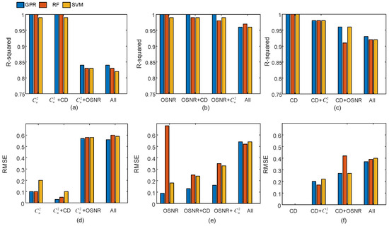 The present section compares the performance of the GPR model with that of two other commonly used ML models, namely SVM and random forest (RF) models. Figure 4 illustrates the performance comparison using R-squared and RMSE metrics. For the turbulence parameter monitoring, it was observed that the GPR model outperformed the other models in terms of both RMSE and R-squared metrics. Specifically, the achieved R-squared was 1 under turbulence conditions alone and also under turbulence and 500 ps/nm CD impairment, as indicated in Figure 4a. Similarly, for these two-channel conditions, the RMSE value was less than 1. However, when the signal was corrupted with turbulence and ASE noise (12 dB OSNR), the R-squared value dropped to 0.84 for the GPR model, which was still slightly better than that of the RF and SVM models. Similarly, the RMSE degraded to 0.55, but still remained better than that of the RF and SVM models as depicted in Figure 4d. The performance of predicting the turbulence parameter under all harsh conditions, i.e., 12 dB OSNR and 500 ps/nm, remained relatively unchanging, as shown in Figure 4a,d.