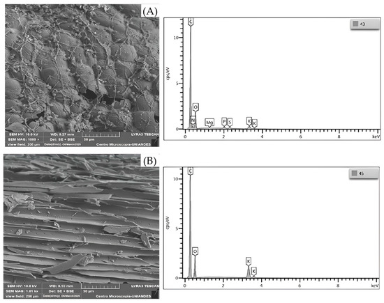 Figure 2A shows the SEM analysis of the unmodified wheat bran biochar (WBC), and Figure 2B shows the KOH-modified biochar (MWBC). Figure 2A presents a rather rough laminar morphology with small lines that may be characteristic of the different elements found in a lignocellulosic material such as wheat; among them, Mg, K, P, S, N, O, and C can be found as the most predominant in the coal structure thanks to the thermal process to which they were subjected (Table 1). Regarding Figure 2B, the effects of basic hydrolysis are observed when the biochar is impregnated with KOH. The surface evidences tubular-type cavities characteristic of cellulose-based materials; also, its porous structure denotes a greater surface area and traits that can be used in adsorption processes [17,33]. In accordance with the energy-dispersive X-ray spectroscopy, the elements with the highest presence in the structure of the MWBC are carbon (59.87% w), oxygen (24.89% w), and potassium (15.25% w), confirming the successful modification process with KOH [17].