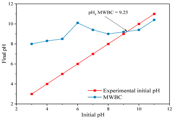 Figure 3 presents the results of the determination of pHPZC for MWBC. This study is meaningful since the electric charges of sorbent materials will depend on the pH of the solution, which relates to the ionization of polar functional groups on the surface of the sorbent [34,35]. The MWBC exhibits a pHPZC of 9.25, which implies that at this value concerning the conditions of the environment, the surface load density of the adsorbent would be zero [36]. Solutions with pH lower than pHPZC will enhance the adsorption of anionic species by electrostatic interaction, and when pH > pHPZC, it will favor the adsorption of cationic compounds by covalent interactions [37].