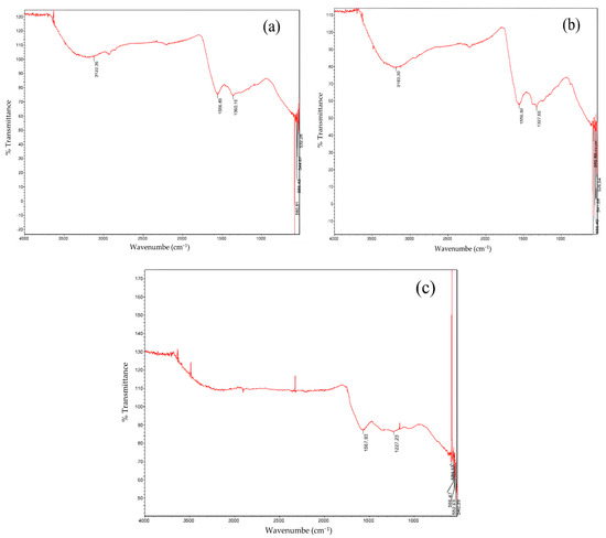 After the adsorption of Cr (VI) (Figure 4c), there is a disturbance in 1567.93 cm−1, which is caused by the strong symmetric stretching of -COO- y -NO2 by effects of nitro aliphatic compounds and carboxylic acid salts, respectively. The strong band in 1227.23 cm−1 is caused by the strong flexion of the -C-C-N group present in the amines [40,41]. The spectra after Cr (VI) adsorption show a low diminution of the band around carboxylic acid salts, denoting that they have enough relevance in Cr (VI) adsorption [42].