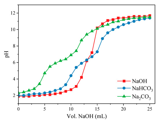 Table 3 shows the results of Boehm titration, presenting the density of functional groups by area unit, i.e., molecules by square nanometer. In addition, Figure 5 shows the behavior of the pH with respect to the amount of titrant species using different bases. The presence of carboxylic superficial groups denotes a high negative load in the material, which is quite related to attracting MB and CR (VI) molecules for being cationic species, which improves adsorption processes [43].