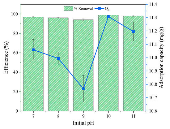 Adsorption processes are highly dependent on the pH of the solution because this variable affects the existent form of the compounds, the surface chemical properties of the adsorbent, the ionization grade of the adsorbent, and the affinity of the adsorbate in the function of the physical state of both materials [44,45].