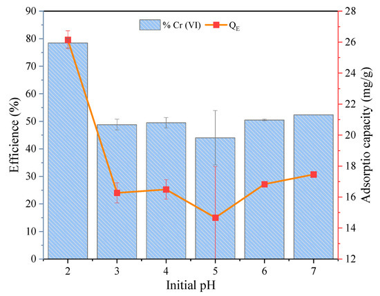 Regarding Cr (VI) adsorption, in Figure 7 it is evidenced that the diminution of the pH caused an increase in the removal efficiency and adsorption capacity, achieving 79.35% y 26.45 mg/g, respectively. The results obtained in the present study are congruent with those reported in the literature, taking into account that, at low pH, the Cr (VI) is presented as Cr2O72− y HCrO4− in water solution, involving a combination with the active site of protonation by electrostatic adsorption [46]. Working at acidic pH allows the surface of the carbon to be positively charged, facilitating the adsorption of forms of Cr (VI) negatively charged [47,48,49]. In addition, at low pH, there are large amounts of H+ ions in the bulk of the solution, leading to a process of protonation of the carbon surface, forming more positively charged sites and increasing the electrostatic attraction between the adsorbent and Cr (VI) [14,37,50]. Furthermore, at pH > 2, a low adsorption performance is presented, caused by the electrostatic repulsion of the anionic Cr (VI) and the KOH-modified wheat carbon, which originally has negative charges given its pHPZC of 9.25 [33].