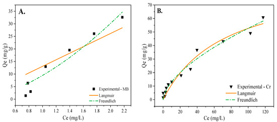 From Figure 10A and Table 4, it is observed that the experimental equilibrium adsorption data of MB are adjusted by Freundlich’s model, indicating that the adsorbent surface is heterogeneous with many unequal active sites and different adsorption energies. Regarding Cr (VI) (Figure 10B), it can be said that the process is described by Langmuir’s isotherm, denoting that at equilibrium, monolayer sorption of the solute occurs at a fixed number of sorption sites homogeneously distributed over the sorbent surface and that these sites also have equal affinity for the adsorbate [51]. Furthermore, it is estimated that the surface effects given by the modification with KOH have positively influenced the affinity between the adsorbate and the adsorbent [52].