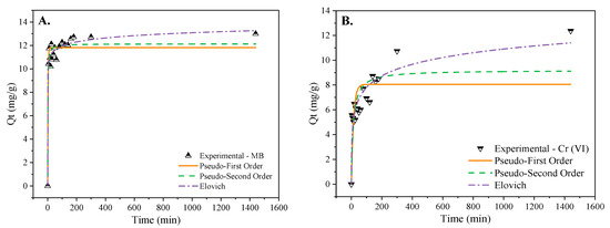 Considering Figure 11A and Table 5, it is evidenced that the MB adsorption kinetic is described by the pseudo-second-order model and Elovich. The above indicates that the process is controlled by physisorption, where the adsorption rate of the dye is proportional to the available sites on the adsorbent, and the reaction rate depends on the amount of dye on the adsorbent surface. Furthermore, there is a coexisting chemisorption mechanism, where the adsorption rate of the dye will decrease exponentially as the amount of dye adsorbed increases [53]. On the other hand, Cr (VI) kinetic was adjusted by Elovich’s model, indicating that the process occurs by chemisorption involving electrostatic interaction and ionic exchange between the adsorbate and adsorbent [54,55].
