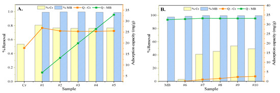 Competitive adsorption of MB and chromium when (A) Cr (VI) is fixed and (B) MB is fixed.