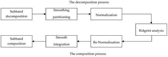 Figure 1. Flowchart of The first-generation curvelet transform algorithm. - Second-generation curvelet transform. The construction of the second-generation curvelet transform differs from the construction of the first generation transform, but the second-generation transform is an improvement of the first-generation transform. The idea behind the first-generation curvelet transform is to partition the target function space into infinitely small blocks to approximate curves as straight lines; then, local ridgelet analysis is utilized. In contrast, the second-generation curvelet transform only retains the abstract principles of the ridgelet transform, such as the framework and tight frame, while discarding its specific computational methods. The continuous curvelet transform serves as an example.The formula for the continuous curvelet transform in the time domain is as follows:whereindicates the position atWhen the angle position of all points at 2() is considered, the curvelet transform can be obtained by rotating the curvelet basis by a certain angle and shifting it by K.The parameter represents the displacement sequence in the 2-dimensional space.