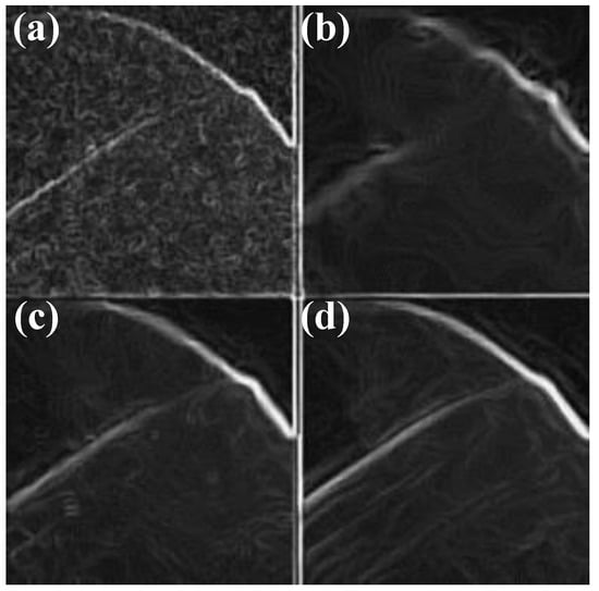 Although the wavelet transform, known as the “mathematical microscope”, can express the details of image waveforms and has significant application value and advantages, it has a limitation due to the lack of anisotropy in wavelet bases. The wavelet transform can only reflect discontinuities or points where the derivative is zero in 1D images, and it cannot capture the edge features of 2D spatial images. Therefore, at the end of the 20th century, Candes developed the ridgelet transform algorithm [], which expresses line singularities and can provide a good approximation of line singularities in multivariable functions. The expression of the ridgelet transform is given by: