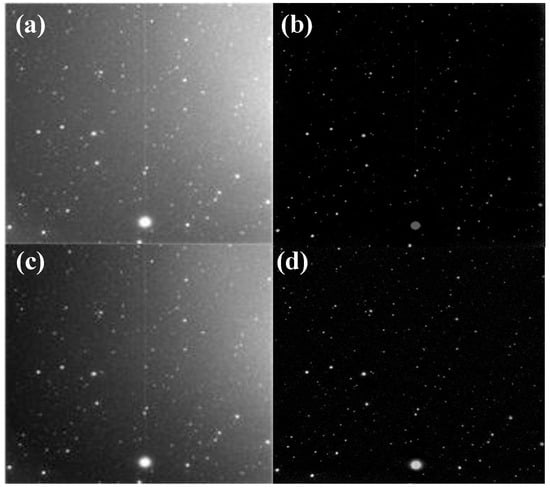 Unlike conventional images, in space target images, the captured images not only contain Gaussian noise, salt-and-pepper noise, Poisson noise, speckle noise, etc., but also the imaging size, shape, and gray value of space targets are highly similar to noise, and the background strength is unevenly distributed due to the scattered light. These factors cause difficulty for traditional image denoising algorithms [,,,,,] to be applied to the denoising of star maps, easily causing loss of target information or false targets. New requirements for image processing technology are needed to suppress or eliminate the complex background interference in star maps while preserving space target information.