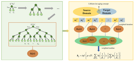 To solve the problem of low prediction accuracy, this section performs migration improvement based on the AdaBoost algorithm and develops the RT-TrAdaBoost model based on the CART-based learner. The model predicts lithium-ion battery RUL using only minimal data samples of the battery under test. It can effectively transfer the concept of lithium-ion battery aging in different distributed datasets from the historical battery dataset to the dataset under test, and its principle is illustrated in Figure 2.