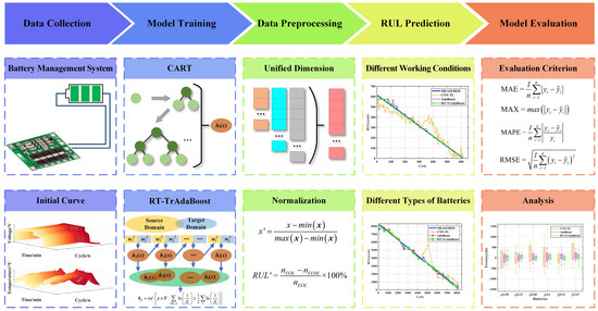 represents the final mapping result. The pseudocode of the RT-TrAdaBoost is given, as shown in Algorithm 1. According to Algorithm 1, if the prediction results of diff-distribution training samples significantly deviate from the actual values in each iteration round, it suggests that these samples may differ greatly from those in the same-distribution training data set and thus fail to accurately reflect battery aging details. Therefore, it is necessary to decrease its weight during training in order to mitigate its impact on the subsequent iteration. The weights of these diff-distribution training samples gradually diverge from those of the same-distribution battery samples. After sufficient iterations, the diff-distribution training weight of samples that better fit the same-distribution will be increased, while those that are dissimilar to the same-distribution training samples can only obtain lower weights. This process is the key component for achieving accurate battery RUL prediction using the proposed method. The flowchart of the entire proposed method is depicted in Figure 3.
