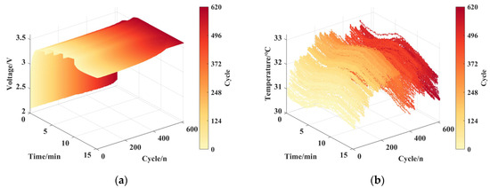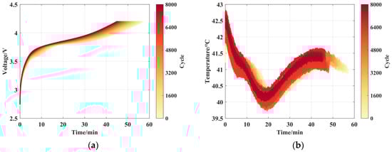 The Stanford–MIT–Toyota dataset experiences complex charging conditions, which exhibit richer characteristics of lithium-ion batteries than its smooth discharge process. The intuitive reflection of this can be observed through the voltage and temperature curve changes in Figure 4. Therefore, the complete charging voltage curve and temperature curve are selected to verify the RUL prediction method proposed in this study. The data selection of the Oxford dataset is also the same as the Stanford–MIT–Toyota dataset.
