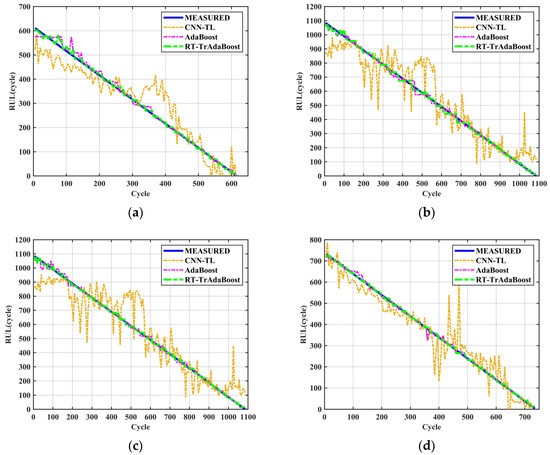From the experimental results in Figure 6, all approaches reflect the overall downward trend of lithium-ion battery RUL. However, there are differences between the three approaches. In the initial stage of RUL decline, the CNN-TL approach tends to exhibit significant prediction errors, whereas AdaBoost and RT-TrAdaBoost demonstrate superior fitting capabilities. In the middle stage of the battery cycle, the CNN-TL approach exhibits some fluctuations and is comparatively less robust than the other two boosting approaches. However, around the 100th and 400th cycles, fluctuations in the AdaBoost approach highlight the limitations of non-transfer learning methods to adapt to changing working conditions.