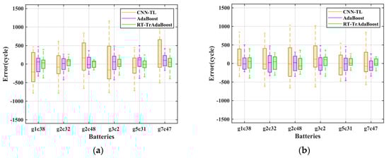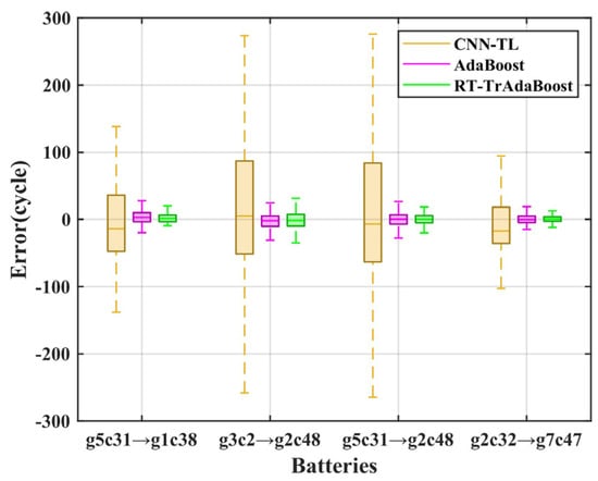 Figure 7 represents a more intuitive comparison of the error distribution between predicted and measured values. The yellow, pink and green parts represent the RUL prediction errors of the CNN-TL, AdaBoost and RT-TrAdaBoost, respectively. The error of the CNN-TL approach is much larger than that of AdaBoost and RT-TrAdaBoost, which confirms the prediction performance of the model in Figure 6. Further analysis shows that in GroupA1, GroupA3 and GroupA4, the RT-TrAdaBoost approach shows better performance than AdaBoost, the distribution of error data is more concentrated, and the error value is also smaller. But in GroupA2, the error performance of the RT-TrAdaBoost model is slightly worse than that of the AdaBoost approach, which may be caused by the fact that the sample size of the source domain in this group is smaller than that of the target domain. In the other three groups, the data size of source domains to battery aging migration is larger than that of the target domains. In comparison, the RT-TrAdaBoost model exhibits better predictive performance when a large number of historical samples are transferred to a smaller sample set.