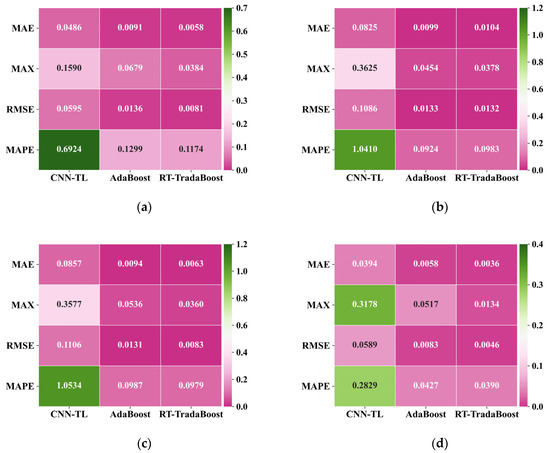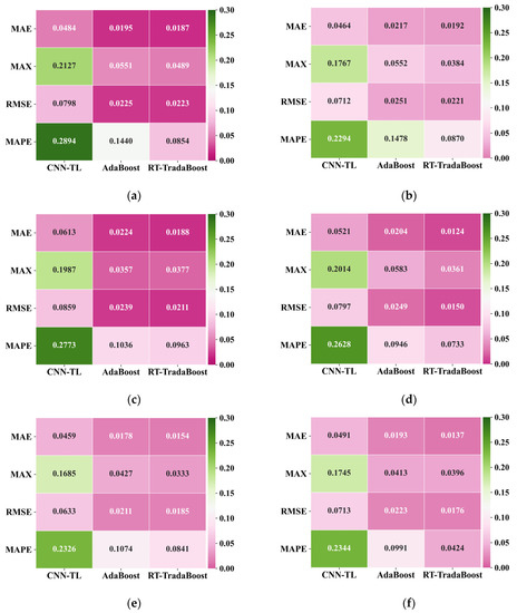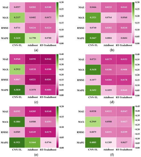 Figure 8 and Table 6 provide a comparative analysis of the evaluation results for each approach. The larger the criteria, the closer the color of the square approaches magenta; otherwise, it tends toward dark green. To highlight the differences in the evaluation criteria of each method in a single group, the color scale of each group is set independently. The MAE of the RT-TrAdaBoost model in the four groups reached 0.58%, 1.04%, 0.63% and 0.36%, respectively. The MAE of the AdaBoost algorithm is 0.91%, 0.99%, 0.94% and 0.58%. While the CNN-TL only performed 4.86%, 8.25%, 8.57% and 3.94%.