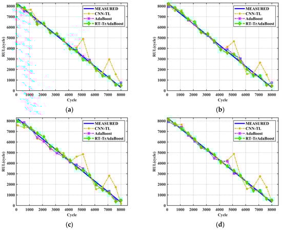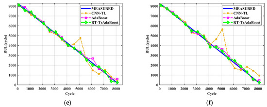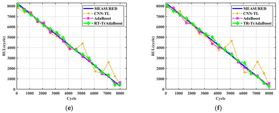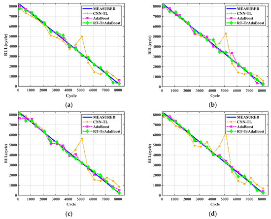 To compare with the proposed RT-TrAdaBoost approach, experiments are also conducted on the more popular convolutional neural network transfer learning (CNN-TL) approach and the AdaBoost approach based on ensemble learning. The CNN-TL has a total of four one-dimensional convolutional layers, four pooling layers and one fully connected layer. The convolutional layer filters are 38, and the kernel size is 32. Both the AdaBoost approach and the RT-TrAdaBoost approach have 15 CART base learners, each with a maximum depth of 5 layers. In particular, as mentioned in Section 2.3, the AdaBoost approach assumes that all data available for training is identically distributed. Therefore, in the case that the target domain samples are insufficient to train the RUL prediction model alone, the target domain and source domain data are combined to train the AdaBoost.