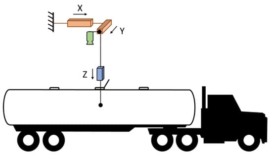 To automate the insertion of the washing head into the tank, a robot manipulator was used. Although tanks are standardized, there are several possible configurations, which differ in the number of manholes and the layout. In addition, the relative position of the man entry to the robot also varies depending on the truck position. It is therefore clear that besides the vertical movement needed for the washing head insertion, additional DoFs (Degrees of Freedom) are needed to meet these variability factors. To meet these requirements, a servo-controlled cartesian robot manipulator was adopted, whose X and Y are, respectively, aligned to the transverse and longitudinal directions of the truck (see Figure 1).