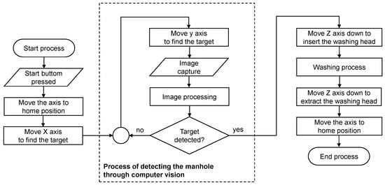 The robotic task can be divided into three main phases, namely (i) searching for the manhole, (ii) washing and (iii) returning to the home position. These phases can be further divided into several steps, as described in the flowchart in Figure 2. Among the various steps that make up the operation cycle, step 3 stands out as the process of detecting the manhole through computer vision. In this step, images are captured while the robot follows a predefined path, which is interrupted when a manhole is found.