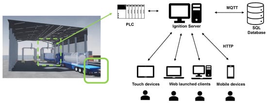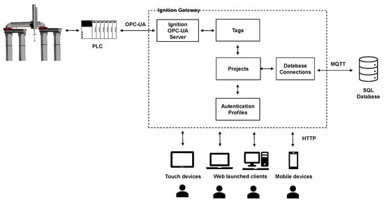 Depending on the size and complexity, SCADA systems can be developed according to different architectures. In this work, the SCADA system architecture (see Figure 4) is centered on a server running the Ignition Gateway and permanently connected to the Internet. This server is connected to the PLC that controls the robot manipulator and to a database that stores the collected data. To control and supervise the process, operators can connect to the server through any device supporting the standard Internet protocols (Transmission Control Protocol/Internet Protocol (TCP/IP) and Hypertext Transfer Protocol Secure (HTTPS)), such as computers, tablets and smartphones.