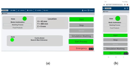 The application for mobile devices was designed to adapt to the device’s screen size, thus ensuring a better user experience. In this way, for screens with a width greater than 500 pixels, the supervision application presents the layout visible in Figure 7a, while the layout for devices with screens smaller than that value is illustrated in Figure 7b. Both applications allow performing the same tasks, with the differences existing strictly in the layout.