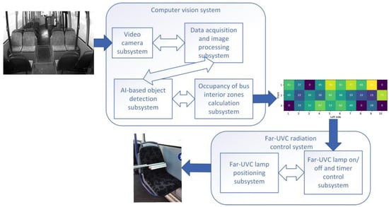 The computer vision system uses a video camera to capture the image of the bus interior, which is processed using filters and noise reduction algorithms. An object detection algorithm is then used to detect passengers and calculate the occupancy of the bus interior. Disinfection of the bus interior is performed by a far-UVC radiation control system, which controls the exposure time and positions the lamps according to the occupancy of the bus interior zones.
