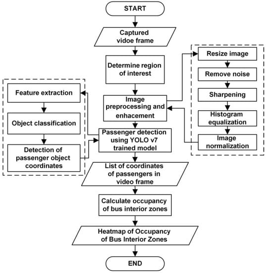 The computer vision system starts the process by capturing an image of the bus interior. It then defines a region of interest that includes the bus seats. The image is then processed by resizing, noise removal, sharpening, histogram equalization, and normalization. In the next step, the image is fed to a trained YOLO v7 model [28], which is capable of distinguishing only people in a video frame. Based on the detected persons, a list of all passenger coordinates in the video frame is generated, and the occupancy of the bus interior zones is calculated by outputting a heat map related to the bus interior zone coordinates.