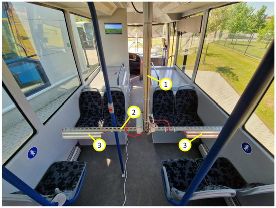 Far-UVC disinfection system installed in M3 category city bus: 1. Robotic lamp positioning and lifting/lowering system; 2. Rotating lamp holder; 3. Far-UVC lamps.