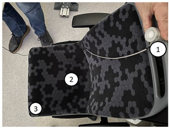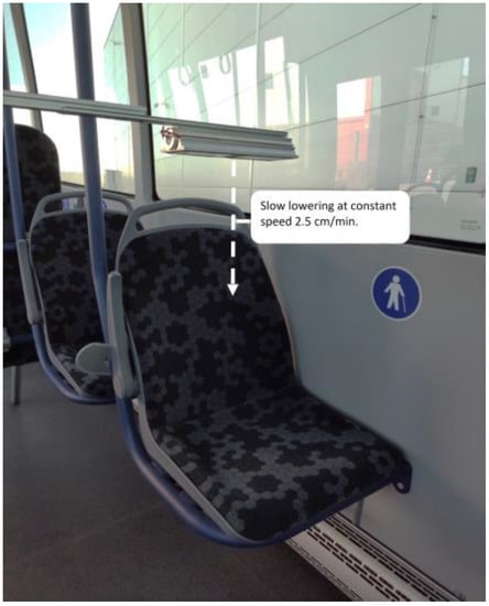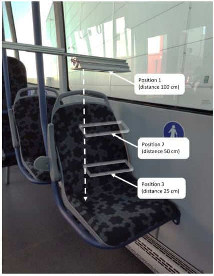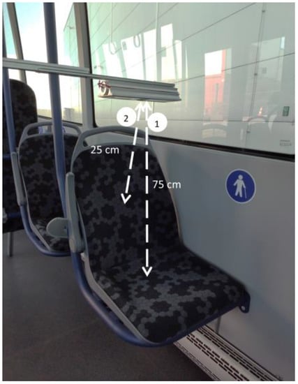 A 12 m long M3 city bus typically has 10 rows of seats, which were used as disinfection zones in this study. By evaluating the occupancy of the interior of the bus, it is possible to disinfect the bus during the journey by disinfecting rows of seats that have become vacant or to disinfect at the end of the journey when the bus is completely empty of passengers. The most frequently touched areas of the bus seats are shown in Figure 5 and during the disinfection process. According to previous studies [6,7], it is important that these areas receive at least 2 mJ/cm2 of irradiation to inactivate the SARS-CoV-2 virus.