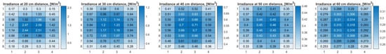 To ensure sufficient surface irradiation for disinfection, an evaluation of the distribution of far-UVC light irradiation on the studied surface was first carried out. For this purpose, the area of the tested irradiated surface of 400 × 600 mm was divided into 32 sectors (4 × 8), and in each sector, the irradiance was measured at different distances between the light source and the surface (20 cm, 30 cm, 40 cm, 50 cm, and 60 cm). The resulting heat maps are shown in Figure 9.