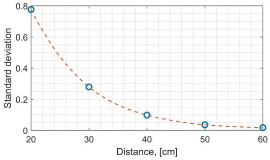 As we can see, at a small distance (20 cm) between the surface and the lamp, the irradiance on the surface is very unevenly distributed, with very high irradiance in the center and very low irradiance at the edges. These differences decrease as the distance increases, but the average irradiance also decreases. The dependence of the unevenness of the surface irradiance on the distance is also clearly visible after calculating the standard deviations of the sector irradiance in Figure 10.