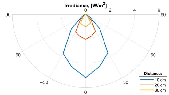 The dependence of the irradiance (measured around the center of the far-UVC lamp) on the distance of the far-UVC source and the measured angle is shown in the polar diagram in Figure 11.