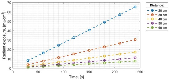 We can see that the beam angle of the far-UVC lamps used in the prototype is approximately 60° and can also see how the irradiance decreases with distance. Correspondingly, the dependences of the irradiance on time and the different distances between the lamp and the surface are shown in Figure 12 and Figure 13.
