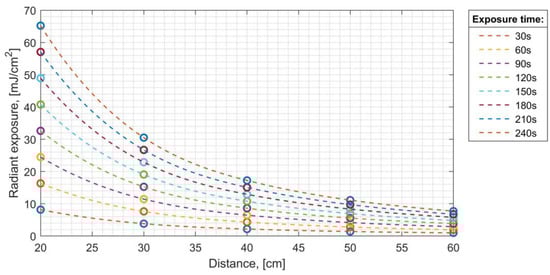 The dependences of radiant exposure on time and the different distances between the lamp and the surface.