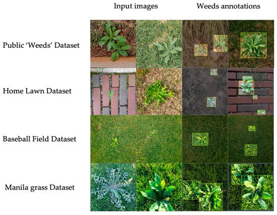 Weeds images and annotations randomly retrieved from the ‘Weeds’ public dataset and the three additional test datasets (Home Lawn, Baseball Field, and Manila grass).