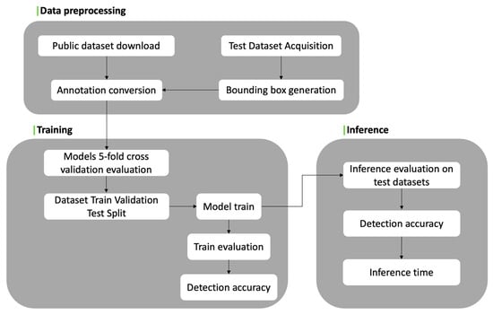 The Robotflow API (https://app.roboflow.com; accessed on 2 July 2023) was used to annotate additional test dataset images and convert them into the respective YOLO version format and dataset split for the five-fold cross-validation.