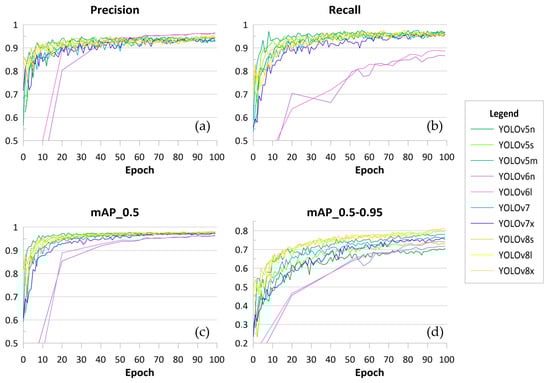 Results of precision (P), recall (R), mean average precision at 0.5 confidence levels (mAP_0.5), and mean average precision at 0.5–0.95 confidence levels (mAP_0.5–0.95) of best YOLO model scales for the four studied YOLO versions trained on the ‘Weeds’ public dataset for 100 epochs. (a) Different model scales Precision values for 100 epochs; (b) Different model scales Recall values for 100 epochs; (c) Different model scales mAP_0.5 values for 100 epochs; (d) Different model scales mAP_0.5:0.95 values for 100 epochs.