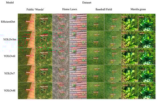 Example of weed detections using the EfficientDet, YOLOv5m, YOLOv6l, YOLOv7, and YOLOv8l models on the four test datasets (public ‘Weeds,’ Home lawn, Baseball Field, and Manila grass).