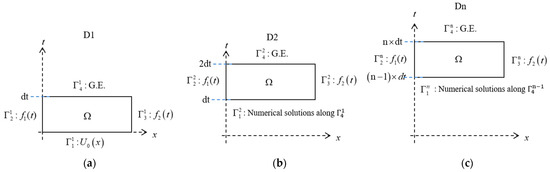 In the previous subsections, the numerical process of the proposed ST-GFDM scheme has actually been introduced, but those processes only work in a single ST domain, . To deal with numerical problems with unpredictable end-times or long temporal scales, a simple technique, the time-marching approach, is used in the proposed numerical scheme. The schematics of the time-marching approach are demonstrated in Figure 2. In Figure 2a, a small-scale ST domain, , is formed when the simulation starts and the distribution of nodes is set up like in Figure 1a. In this ST domain, the initial conditions are satisfied along , , and , which satisfy the boundary conditions and , respectively. The governing equation (Equation (1)) is satisfied on and . Then, the numerical processes in Section 3.1 and Section 3.3 are applied to obtain the numerical solutions in the D1 domain. Once the numerical procedures within D1 are completed, the D1 will be shifted by distance dt along the t-axis, and the 2nd small-scale ST domain is formed as shown in Figure 2b.