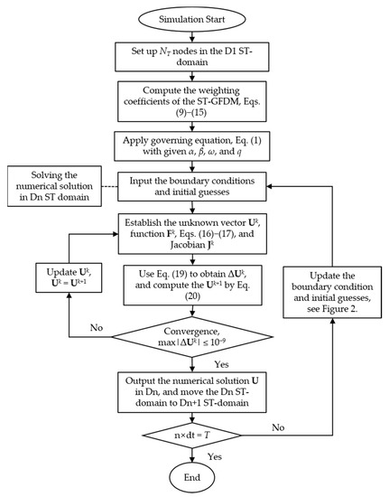 The numerical processes within D2 are the same as the D1, but the boundary conditions along are different. In , the numerical solutions at in D1 are treated as the initial conditions for D2. Thus, the numerical solutions in D2 can be solved by the proposed ST-GFDM and the two-step Newton’s method. It should be noted that the coordinates between D1 and D2 are relative locations. Thus, the weighting coefficients of the proposed ST-GFDM in D1 are the same as those of each ST domain generated by the time-marching approach. After moving the ST domain within n times, the n-th ST domain, , is generated (see Figure 2c), and the numerical solutions are solved. The simulation will finish when n × dt reaches the specified end-time determined by the numerical example. To summarize the above numerical process, the flowchart is shown in Figure 3. In the next section, four numerical examples are provided to verify the proposed ST-GFDM scheme.