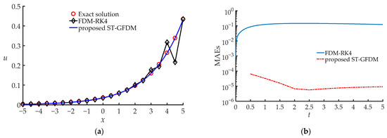 The comparisons of the FDM-RK4 and proposed ST-GFDM. (a) The numerical solution at t = 5 and (b) the MAEs curves in the entire simulation of Example 1.