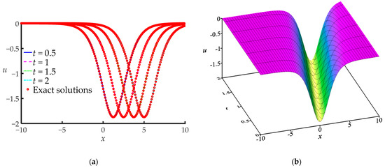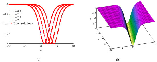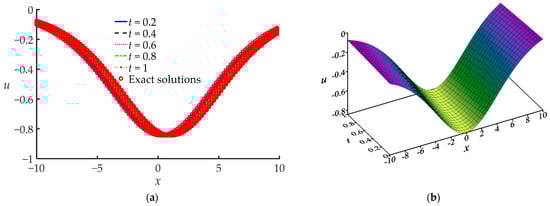 The following parameters are used in this numerical example: a = −10, b = 10, dt = 0.2, T = 1, ND = 10, NT = 40,421, and ns = 20. The numerical solutions are displayed in Figure 6. In Figure 6a, the comparison of the exact solutions and the numerical solutions at specific time levels (t = 0.2, 0.4, 0.8, and 1) is shown. These numerical results are in good agreement with the exact solutions. In addition, the MAEs at specific points (x,t) are listed in Table 6 with the errors of the MVIA [5] and VIM [8]. Obviously, the error performance of the proposed numerical scheme is better than that of the other two approximation algorithms. Also, it verifies that the proposed ST-GFDM is fully capable of handling such complex PDEs.