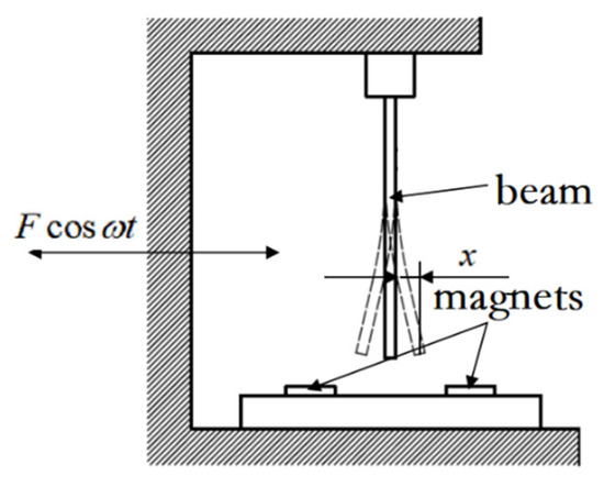 As shown in Figure 1, the structure of the model is mainly composed of two electromagnets and a cantilever beam, and the electromagnet is fixed on a sliding table. The end of the cantilever beam is recorded as the displacement of the oscillator. When the cantilever beam is not deformed, the horizontal position directly below it is the origin of the displacement. After the electromagnet is energized, the cantilever beam is deformed under force, and there is a stable point on the left and right sides. The displacement of the left stable point is recorded as −1, and the displacement of the right stable point is recorded as 1. Assuming that the sliding platform moves in the way of , the mathematical model of the traditional Holmes–Duffing system shown in Equation (1) below can be established.