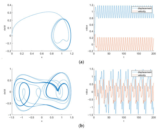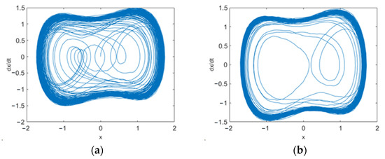 Under the system parameters in this paper, the frequency of the built-in force is set as 1 rad/s. According to the above calculation method, when the amplitude of the built-in force is 0.826, the maximum Lyapunov index is positive, and the system is in a chaotic state. When the amplitude of the built-in force is 0.827, the maximum Lyapunov index is negative, and the system is in a large-scale periodic state. Therefore, the chaotic threshold of the system is 0.826. The phase trajectory diagram when the built-in force is 0.826 and 0.827 is shown in Figure 4.