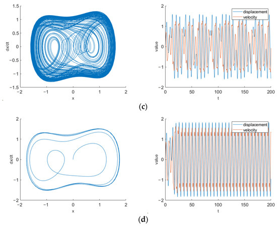 Phase plane diagram and domain diagram of Duffing system. (a) = 0.2, homoclinic orbit; (b) = 0.5, periodic bifurcation; (c) = 0.8, chaotic state; (d) = 1, large-scale periodic state.