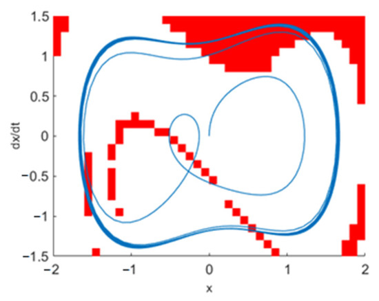 After traversing the initial value points within the calculation range, we can obtain regions that can make the variance of the output value increase steadily. As shown in Figure 5, The red area is stable, select points close to the large periodic orbit as the initial value of the system in these regions. At these locations, the oscillator can quickly enter the orbit, which is conducive to the identification of the system state. According to the calculation results in Figure 5, the initial values of velocity and displacement selected in this paper are 1.2 and 0, respectively. Under this initial value, the chaos threshold is calculated according to Section 4.2, and the chaos threshold at this time is 0.825. In this paper, the variance of the output value when the built-in force is 0.825 is selected as ; its value is 2.0333. The variance of the system output value when the built-in force is 0.826 is selected as ; its value is 2.4028. According to the criteria in Section 4.1, when the double-coupled Duffing system is excited by the signal to be tested, if its square difference jump rate exceeds 0.8, that is, the variance of the output value exceeds 2.3289, it can be considered that the signal to be tested has been detected.