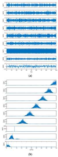 According to the method in Section 4.3, the signal is first decomposed by EMD, and nine IMF components are obtained after EMD decomposition. Set the number of IMF components of the VMD algorithm to 9 and perform VMD decomposition. The IMF components and their center frequencies are obtained as shown in Table 1. The time domain diagram and frequency domain diagram of each IMF are shown in Figure 11.