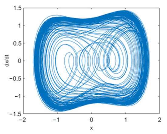 As shown in Figure 9, it can be observed that the double-coupled Duffing system is in a large-scale periodic state. At this time, the variance of the output value of the system is 2.5125. According to the judgment method in Section 4.3, its variance jump rate has exceeded the threshold, and it can be considered that the signal to be measured has been detected, but at the same time, it can also be observed that, due to the interference of other frequency components with high energy, the phase plane trajectory of the system has been deformed, which will affect the detection performance. Delete the periodic signal component of 10 rad/s in Equation (19) and excite the double-coupled Duffing system again to obtain the phase plan as shown in Figure 10.