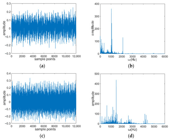 Time domain and frequency domain plots of experimental data. (a) Time domain diagram (normal); (b) frequency domain diagram (normal); (c) time domain diagram (inner fault); (d) frequency domain diagram (inner fault).